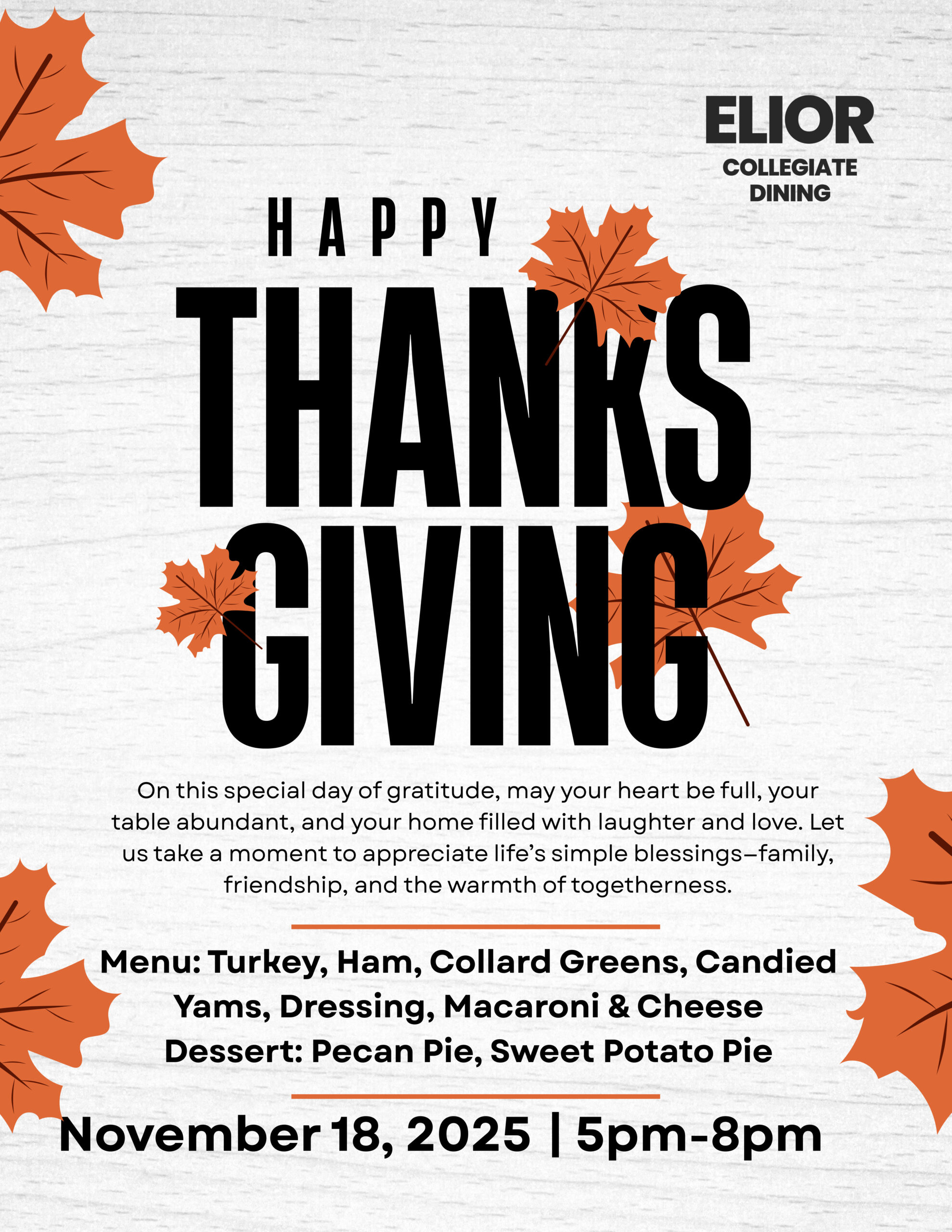 From Elior Collegiate Dining: On this special day of gratitude, may your heart be full, your table abundant, and your home filled with laughter and love., Let us take a moment to appreciate life’s simple blessings – family, friendship, and the warmth of togetherness.